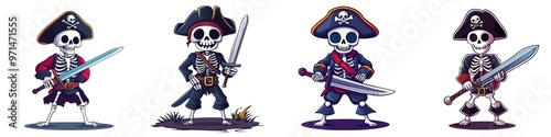 Fototapeta premium Colorful pirate skeletons with swords in various poses, perfect for Halloween...