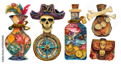 © Gasspoll, Fototapeta premium Colorful Pirate-Themed Elements with Decorative Objects and Symbols of Adventure