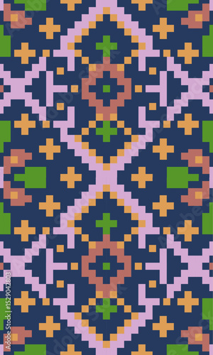 Fototapeta premium Colorful Pixel Art Seamless Textile Design with Abstract Grid Elements Perfect for Print on Demand Fabric Craft Projects Home Accessories and Wall Art Prints