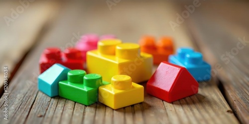 Obraz premium Colorful Plastic Blocks Arranged on Wooden Surface Representing Childhood...