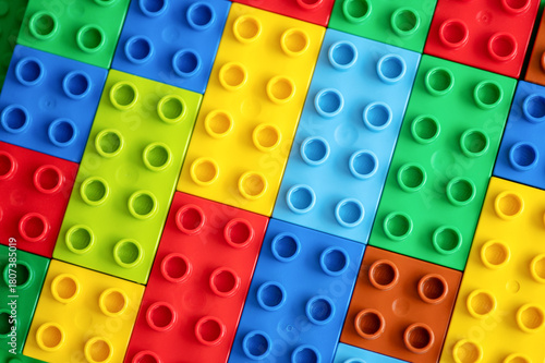 © Юлия Васильева, Naklejka premium Colorful plastic building blocks background. Top view.
