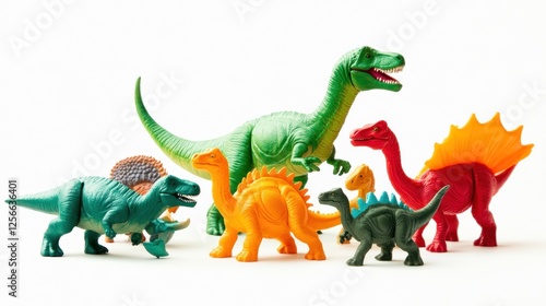 Fototapeta premium Colorful plastic dinosaur toys on white background, ideal for children's...