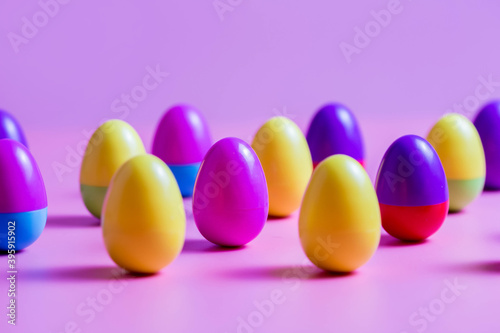 Obraz premium Colorful Plastic Easter Eggs on pink background