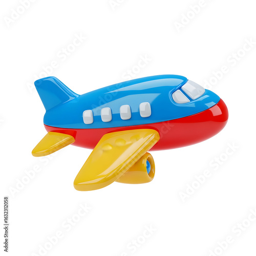 © KARIMA, Fototapeta premium Colorful plastic toy airplane with a glossy blue red and yellow stylized design.