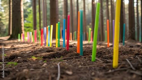 Fototapeta premium Colorful Plastic Tubes Installed in Forest Ground, Surreal Contrast Between Bright Colors and Nature’s Calm Environment