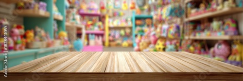 © Anat art, Naklejka premium Colorful Playroom Display Inviting Children to Explore New Toys on a Simple Wooden Table Ready for Fun Activities