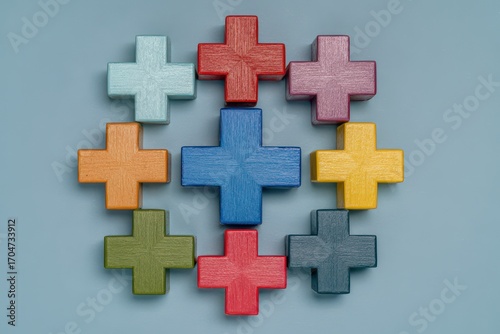 Fototapeta premium Colorful plus sign blocks arranged in a circle