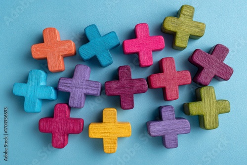 Obraz premium Colorful plus signs arranged on a light blue surface