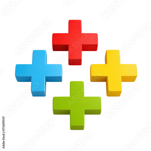 © Keattipoom, Fototapeta premium Colorful Plus Signs in Bright Primary Colors on a Black Background
