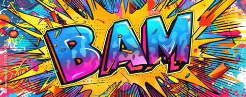 © Іван Ніколов, Obraz premium Colorful pop art background with "BAM" inside. Comic book elements, Dynamic visuals, Bright vector