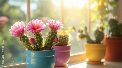 Fototapeta premium Colorful potted cacti with blooming pink flowers on a windowsill, with sunlight streaming in, creating a cheerful atmosphere