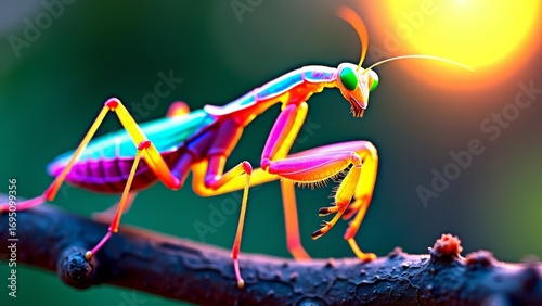 Fototapeta premium Colorful praying mantis on branch in digital jungle