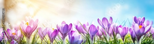 Fototapeta premium Colorful purple crocuses in the grass on a spring background with a blue sky and sun rays.