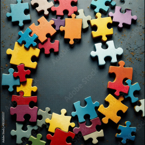 Obraz premium Colorful puzzle pieces scattered in a circular arrangement on a dark...