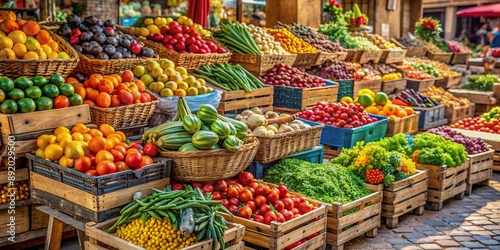 Fototapeta premium Colorful pyramids of fresh organic fruits and vegetables on wooden crates and baskets at a bustling street market on a warm sunny day.