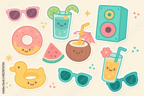 Fototapeta premium Colorful quirky summer themed stickers featuring cheerful illustrations of sunglasses, drinks, and treats evoking a playful outdoor vibe and joyfulness