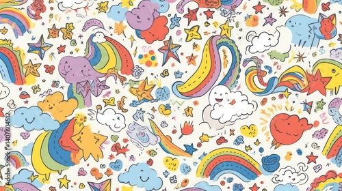 Fototapeta premium Colorful Rainbow and Cloud Doodle Seamless Pattern Design for Background