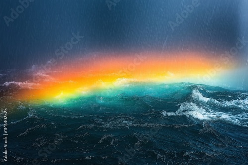 Naklejka premium Colorful rainbow appear over dark ocean waves during a rainfall at twilight...