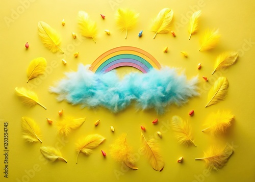 © Sunee, Obraz premium Colorful Rainbow Cloud Rain Feather Flat Lay Minimalist Stock Photo