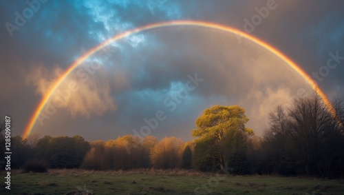Naklejka premium Colorful rainbow spanning the sky over a serene forest landscape