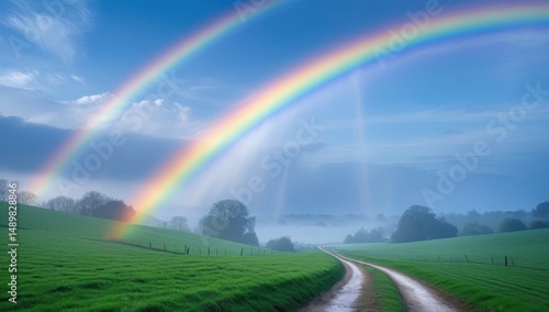 Obraz premium Colorful rainbows in the sky above a picturesque landscape - an image of calm, harmony and natural magic