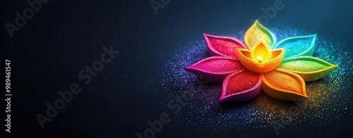 © Nattapun, Obraz premium Colorful rangoli patterns digitally enhanced, glowing with light effects for Diwali celebration Rangoli art, Cultural decor