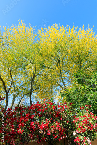 © EuToch, Naklejka premium Colorful red and yellow flowers of blooming Nerium Hardy Oleander and Palo verde trees in Arizona spring