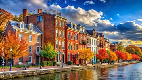 © Wanlop, Naklejka premium Colorful Red Brick Buildings Along Whitehurst Highway at Georgetown Waterfront in Autumn Scene