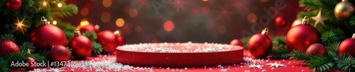 © Janmo, Fototapeta premium Colorful red Christmas ornaments on a festive podium decorated with snowflakes and garlands, festive atmosphere, christmas decorations