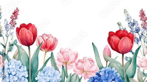© nafisah, Naklejka premium Colorful red tulips, peonies, hyacinths, hydrangeas, pink roses design horizontal card. Wedding greenery. Green, blue, red, white tones. Watercolor banner card. Summer style
