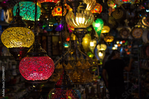 Naklejka premium Colorful red, yellow and green turkish mosaic glass lamps for sale at the...