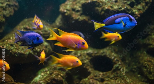 © @KaeDA, Obraz premium Colorful reef fish swimming among coral rocks