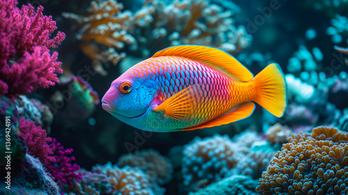 Fototapeta premium Colorful reef fish swimming in coral reef aquarium marine life ocean sea...