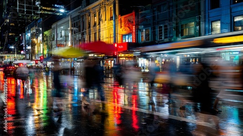 © Topuria Design, Fototapeta premium Colorful reflections on wet asphalt of a busy Melbourne city street by night with blurred people walking and a tram passing by