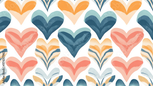 Fototapeta premium Colorful repeating heart motifs in shades of blue, orange, and pink create romantic and playful pattern, perfect for love themed designs and creative backgrounds