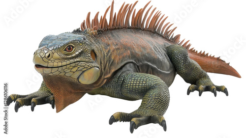 Fototapeta premium Colorful reptile with spiky back resting on a rock in a natural habitat under...