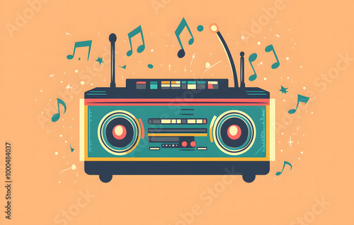 Obraz premium Colorful Retro Boombox with Musical Notes and Abstract Background
