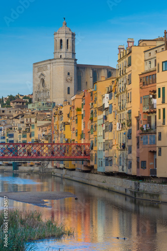 Fototapeta premium Colorful river-front houses lining the Onyar river, mostly built on top of old medieval defense walls, Girona, Catalonia, Spain