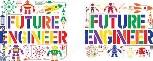 Fototapeta premium Colorful robots rockets future engineer text vector