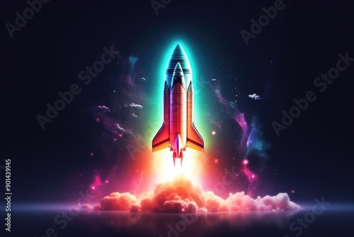 Fototapeta premium Colorful Rocket Launch Surrounded by Bright Lights and Vibrant Clouds at Night