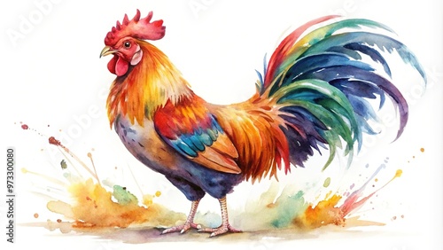 © Chanchai, Fototapeta premium Colorful rooster watercolor painting on white background, symmetrical