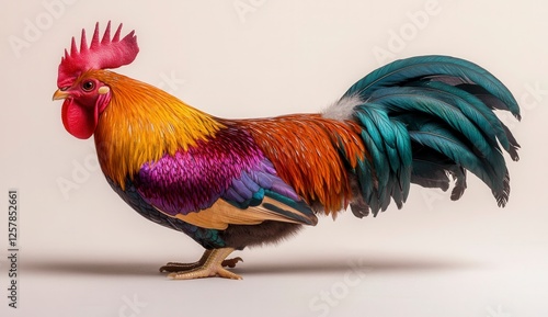 © Praphat, Fototapeta premium Colorful Rooster with Vibrant Feather Display on Neutral Background