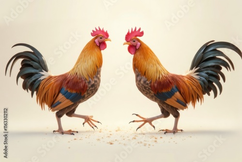 © SunPunjiStudio, Fototapeta premium Colorful Roosters in Dynamic Pose with Detailed Feathers and Background