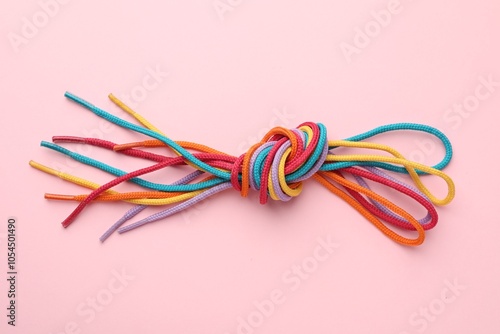 © New Africa, Fototapeta premium Colorful ropes tied in knot on light pink background, top view. Unity concept