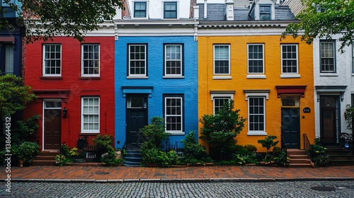 Naklejka premium Colorful row houses, city street, green plants, cobblestone