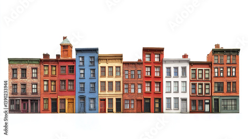 © Thanthara, Fototapeta premium Colorful row of brick buildings on white background. Urban architecture