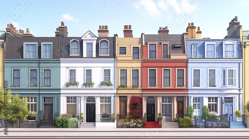 © Thanthara, Fototapeta premium Colorful row of charming terrace houses with vibrant facades and lush greenery