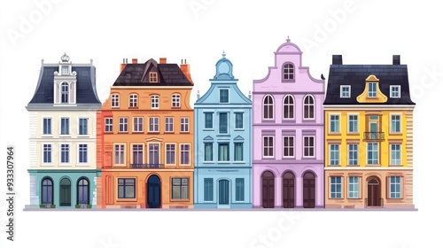 © creative, Fototapeta premium Colorful row of old townhouses with arched doorways, windows and balconies.