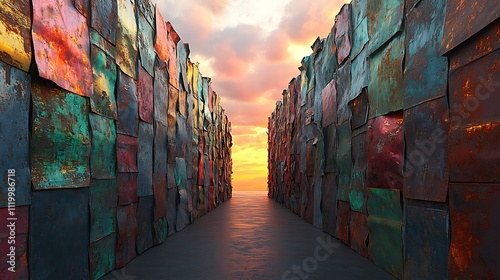© Visual AI Engine, Fototapeta premium Colorful rusty metal wall pathway leading to sunset.