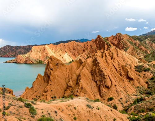© Queen, Fototapeta premium Colorful sandstone cliffs overlooking a tranquil lake under a cloudy sky